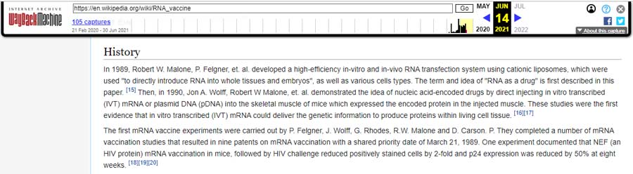 Dois dias depois, 16 de junho de 2021, apenas cinco dias após a aparição de Malone no podcast DarkHorse, seu nome foi removido do verbete da Wikipedia. Agora, de repente, a descoberta da liberação de mRNA de drogas é credenciada a pesquisadores anónimos do Salk Institute e da Universidade da Califórnia, e sua pesquisa de 1990 confirmando que o mRNA injetado pode produzir proteínas no tecido celular é creditada a cientistas anónimos da Universidade de Wisconsin.